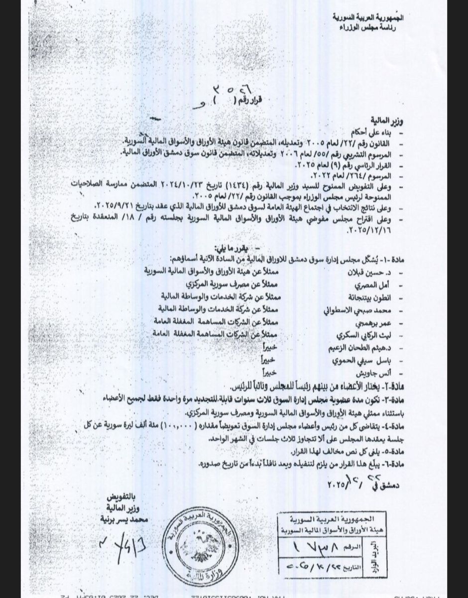 تم انتخاب مجلس إدارة جديد لسوق دمشق للأوراق المالية برئاسة عمر برهمجي، في حين انتخب انطون بيتنجانة نائبا لرئيس مجلس الإدارة، و تشكيل لجان مجلس الإدارة، وذلك لاحقا لقرار وزير المالية بتشكيل مجلس الإدارة.
