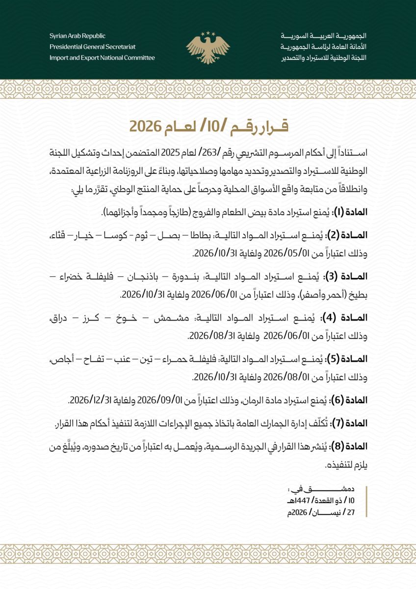 ويبدأ اعتباراً من الأول من أيار وحتى نهاية تشرين الأول منع استيراد البطاطا والبصل والثوم والكوسا والخيار والقثاء.